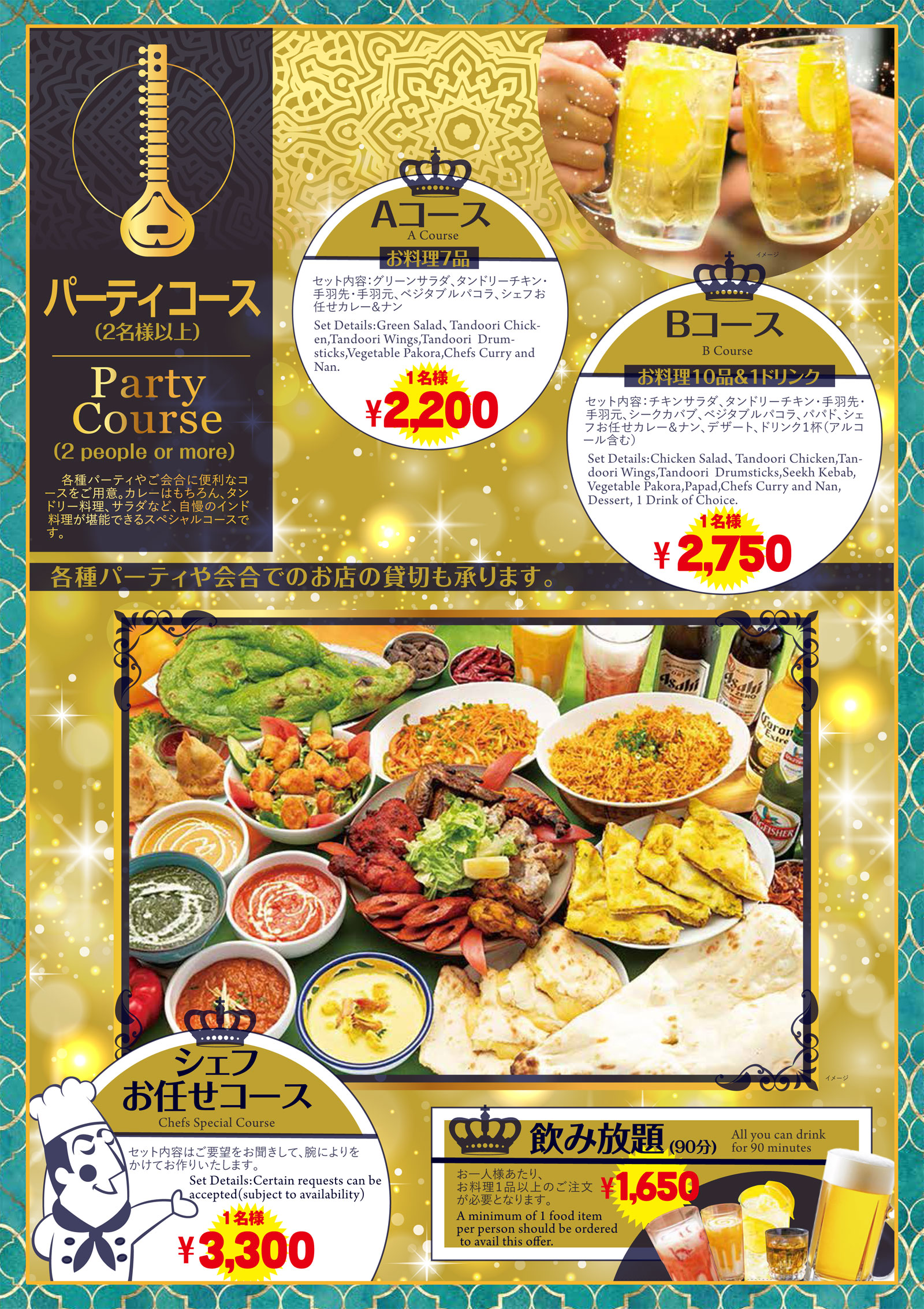 タンドリーチキン 手羽先 手羽元 シークカバブ ベジタブルパコラ インド風焼きそばスープ パパド シェフお任せカレー&ナン デザート ドリンク一杯(アルコール含む) |